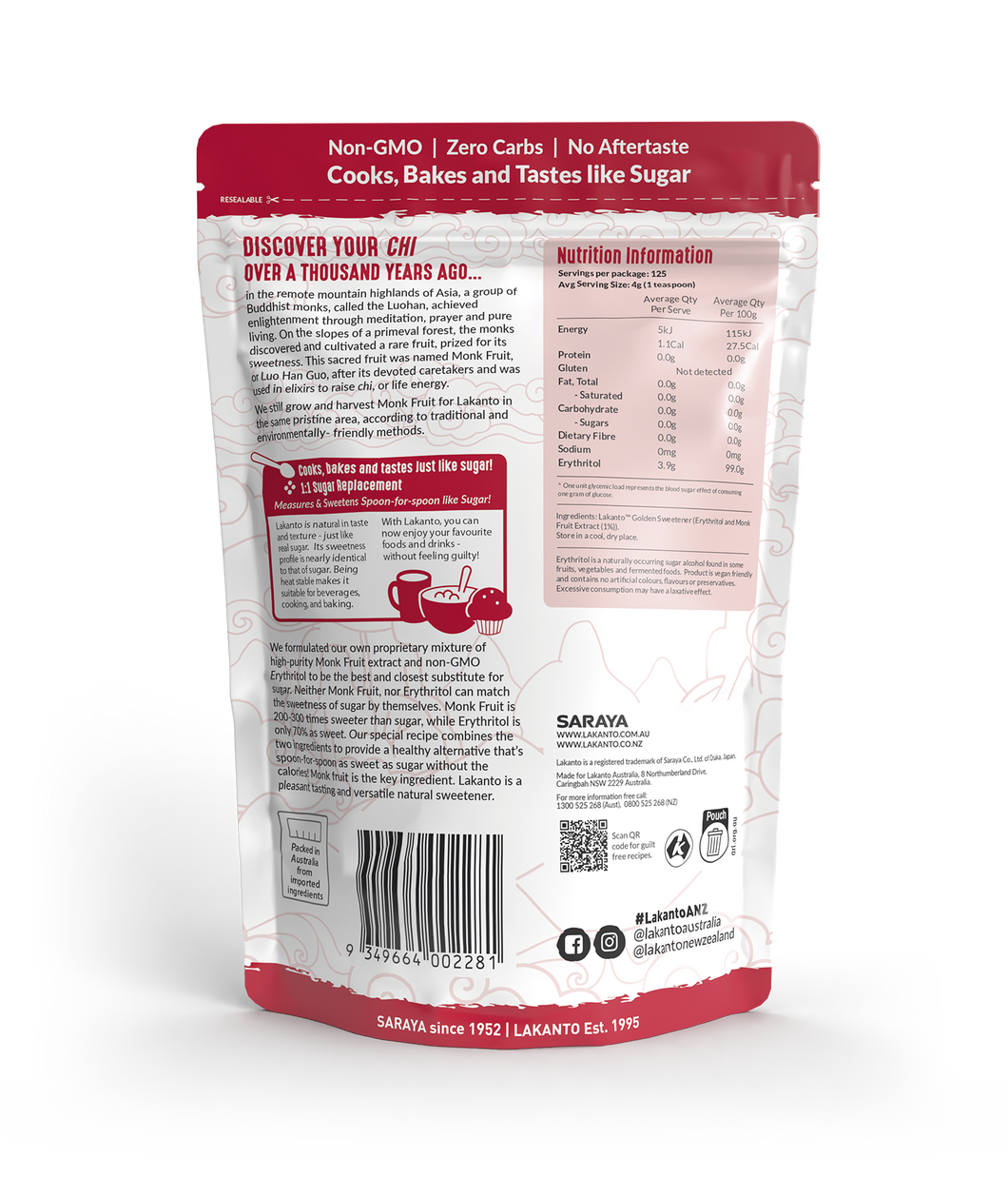 Lakanto Monkfruit Sweetener is a low calorie, zero glycaemic sweetener that is just like sugar. It is made from Monk Fruit which was used for centuries in eastern traditional herbalism to increase chi and well-being, earning it the nickname “The Immortals’ Fruit”. We still grow and harvest Monk Fruit for LAKANTO® in the same pristine area and according to traditional and environmental methods.